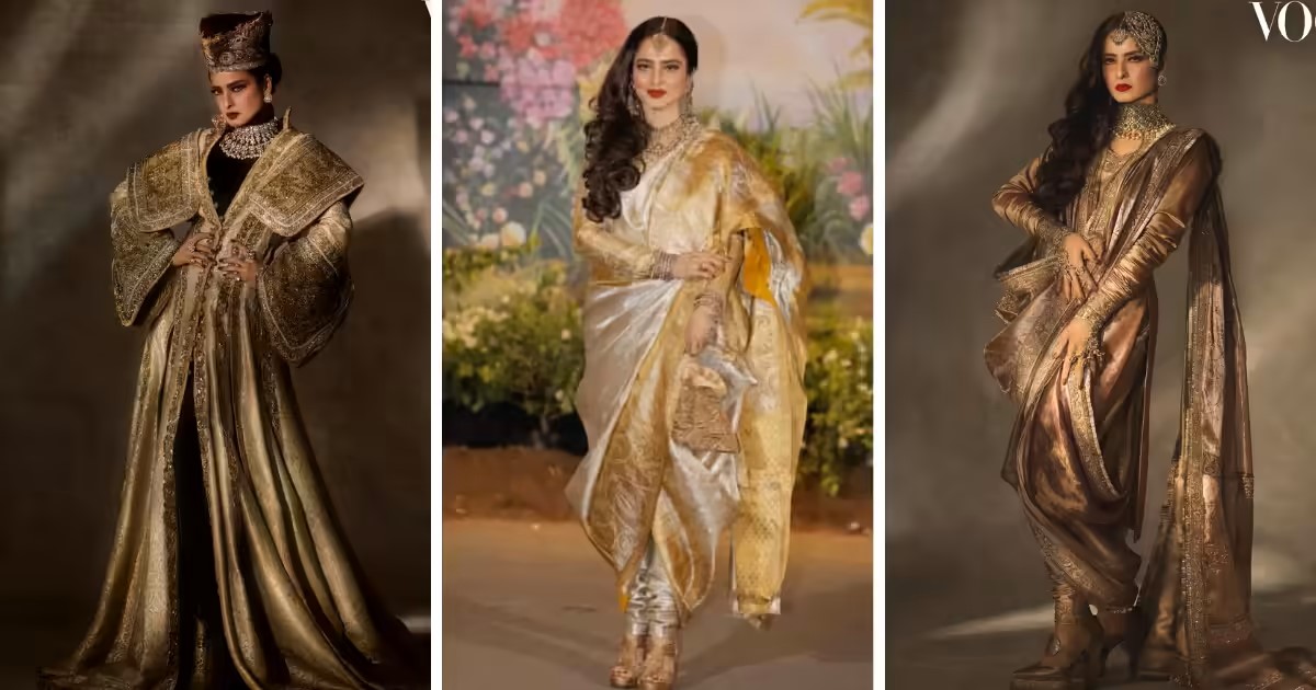 रेखा की पहचान उनके अभिनय से पहले उनके साड़ी लुक से होती है। उनकी कांजीवरम साड़ियों की चमक, गोल्डन बॉर्डर का आकर्षण और पारंपरिक ज्वेलरी का मेल — यह सब मिलकर रेखा को हर बार किसी रॉयल इवेंट की महारानी जैसा रूप देता है। चाहे कोई अवॉर्ड शो हो या फिल्म फेस्टिवल, रेखा का हर लुक एक फैशन शो की शोभा बढ़ा देता है।