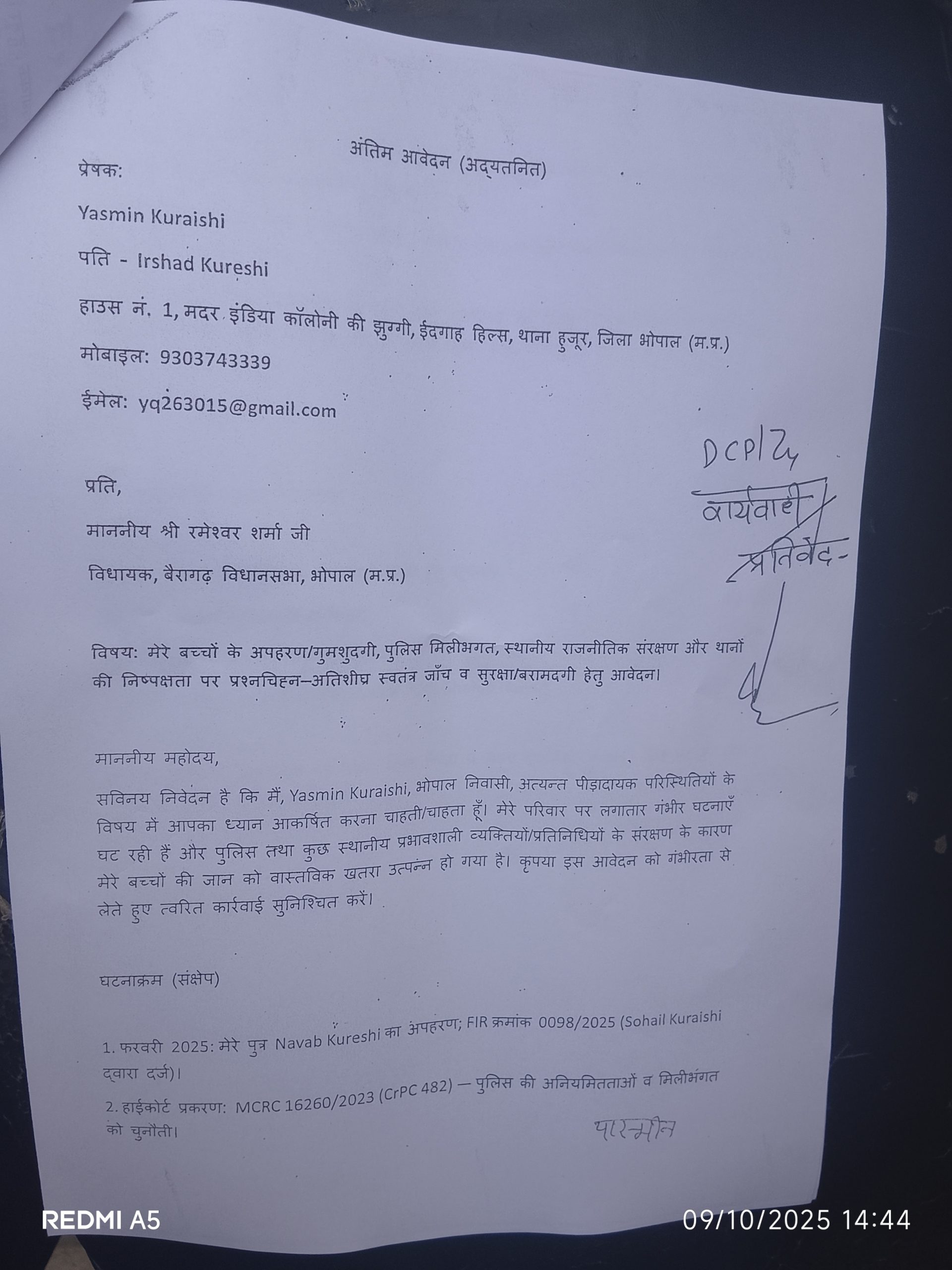 भोपाल में यासमीन कुरैशी प्रकरण एक बार फिर चर्चा में है। गृह विभाग, मध्य प्रदेश शासन द्वारा जारी स्पष्ट आदेश के बावजूद पुलिस प्रशासन की निष्क्रियता पर अब सवाल उठने लगे हैं।